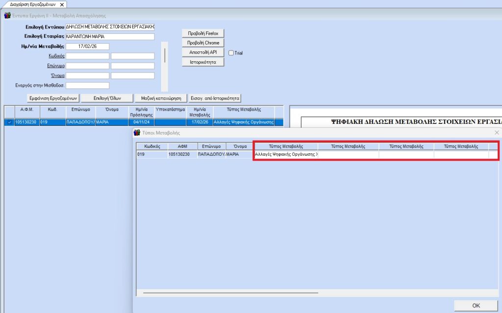 Επιλέον εαν με το ίδιο έντυπο γίνονται περισσότερες απο μια μεταβολές πατώντας διπλό κλικ στο πεδίο «Τύπος Μεταβολής» ανοίγει 2ο παράθυρο όπου μπορείτε να τις επιλέξετε.