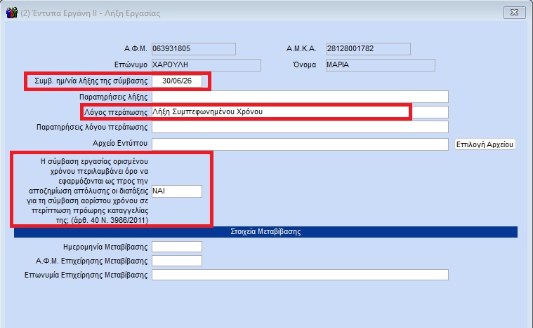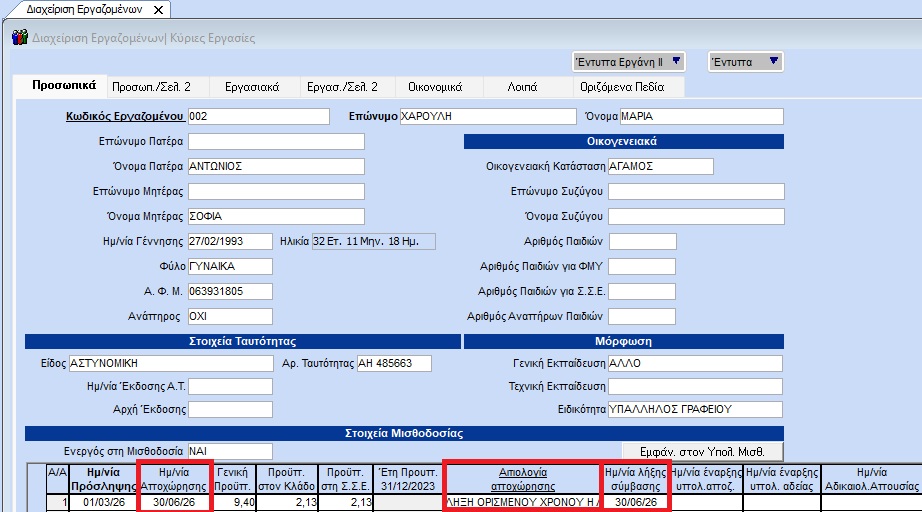 Απο το menu «Εργαζόμενοι/Κύριες Εργασίες/Διαχείριση Εργαζομένων» επιλέγετε τον εργαζόμενο και στο tab «Προσωπικά» συμπληρώνετε την ημερομηνία αποχώρησης και ως αιτιολογία αποχώρησης «ΛΗΞΗ ΟΡΙΣΜΕΝΟΥ ΧΡΌΝΟΥ Ή ΛΗΞΗ ΈΡΓΟΥ».Στο πεδίο «Ημ/νία λήξης σύμβασης» καταχωρείτε την συμβατική ημερομηνία λήξης σύμβασης (την αρχική δηλαδή ημερομηνία λήξης της σύμβασης ορισμένου χρόνου). Η παγματική ημερομηνία αποχώρησης μπορεί να είναι μικρότερη ή ίση της συμβατικής ημερομηνίας αποχώρησης. Με F12 αποθηκεύετε.