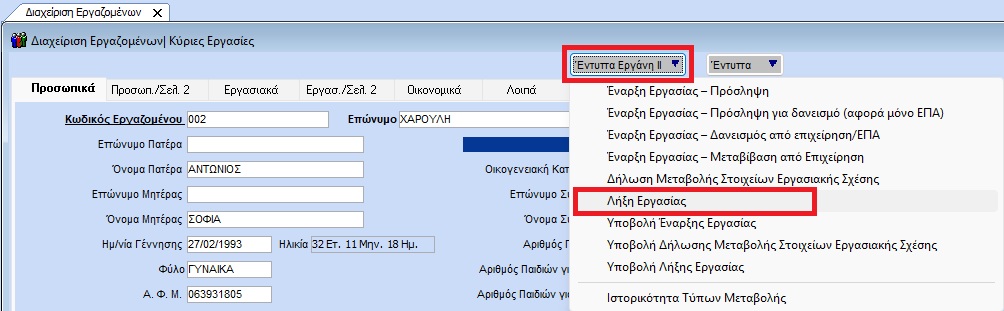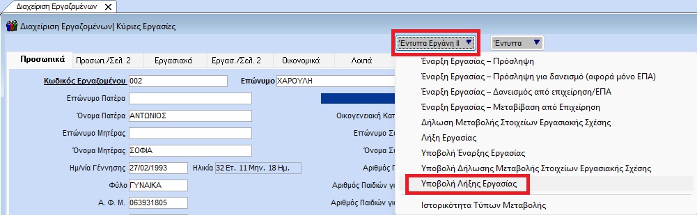 Στη συνέχεια μεταβείτε στην διαδρομή «Εργαζόμενοι/ Κύριες Εργασίες/ Διαχείριση Εργαζομένων» πατήστε το πλήκτρο Έντυπα Εργάνη II και επιλέξτε «Λήξη Εργασίας».