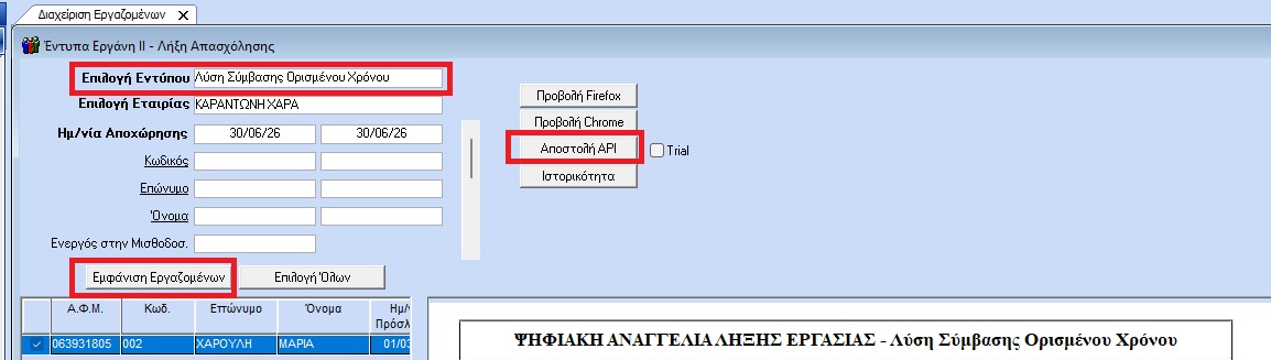 Στο κριτήριο «Επιλογή Εντύπου» επιλέγετε Λύση Σύμβασης Ορισμένου Χρόνου, στην «Ημ/νία Αποχώρησης» συμπληρώνετε την ημερομηνία αποχώρησης και με το πλήκτρο «Εμφάνιση Εργαζομένων» εμφανίζεται ο εργαζόμενος. Η υποβολή ενεργοποιείται πατώντας το πλήκτρο «Αποστολή API».