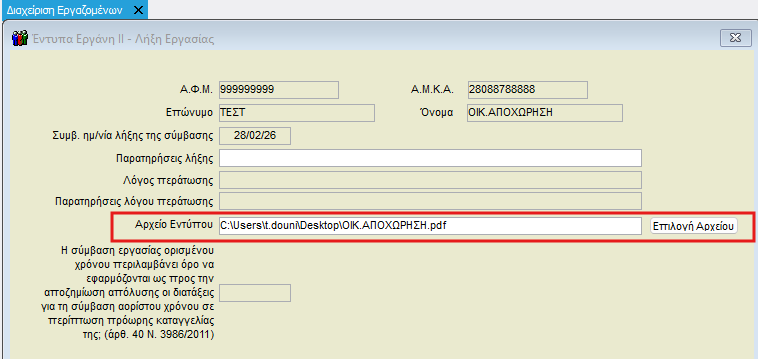 Στο πεδίο «Αρχείου Εντύπου» πατώντας το πλήκτρο «Επιλογή Αρχείου» επισυνάπτεται το υπογεγραμμένο έντυπο Αποχώρησης (σε μορφή pdf). Αν ο εργαζόμενος είναι αλλοδαπός τα νομιμοποιητικά έγγραφα θα πρέπει να τα επισυνάψετε στο έντυπο της Πρόσληψης και όχι στο πεδίο “Αρχείο Εντύπου” που φαίνεται στην παρακάτω εικόνα.