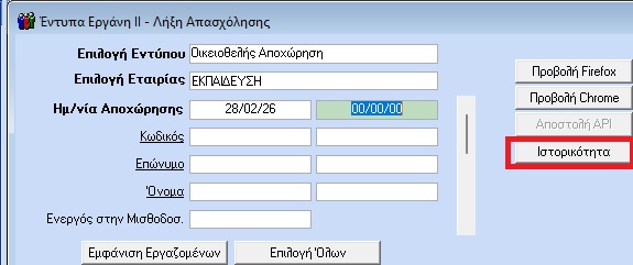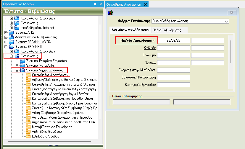 Για την εκτύπωση του εντύπου Οικειοθελούς Αποχώρησης ο χρήστης ακολουθεί τη διαδρομή «Έντυπα- Βεβαιώσεις/ Έντυπα Εργάνη II/ Εκτυπώσεις/ Λήξη Απασχόλησης». Επιλέγετε το έντυπο Οικειοθελής Αποχώρηση και στο κριτήριο «Ημ/νία Αποχώρησης» συμπληρώνετε την ημερομηνία ή το διάστημα ημερομηνιών και με F8 εκτυπώνετε.