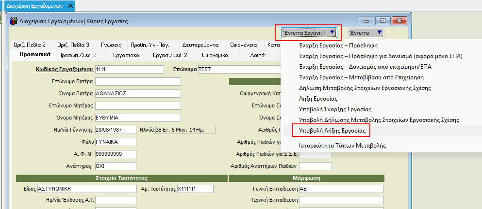 Απο το menu «Εργαζόμενοι/Κύριες Εργασίες/Διαχείριση Εργαζομένων» επιλέγετε τον εργαζόμενο και στο tab «Προσωπικά» συμπληρώνετε την ημερομηνία αποχώρησης και ως αιτιολογία αποχώρησης «ΟΙΚΕΙΟΘΕΛΗΣ ΠΑΡΑΙΤΗΣΗ». Με F12 αποθηκεύετε.