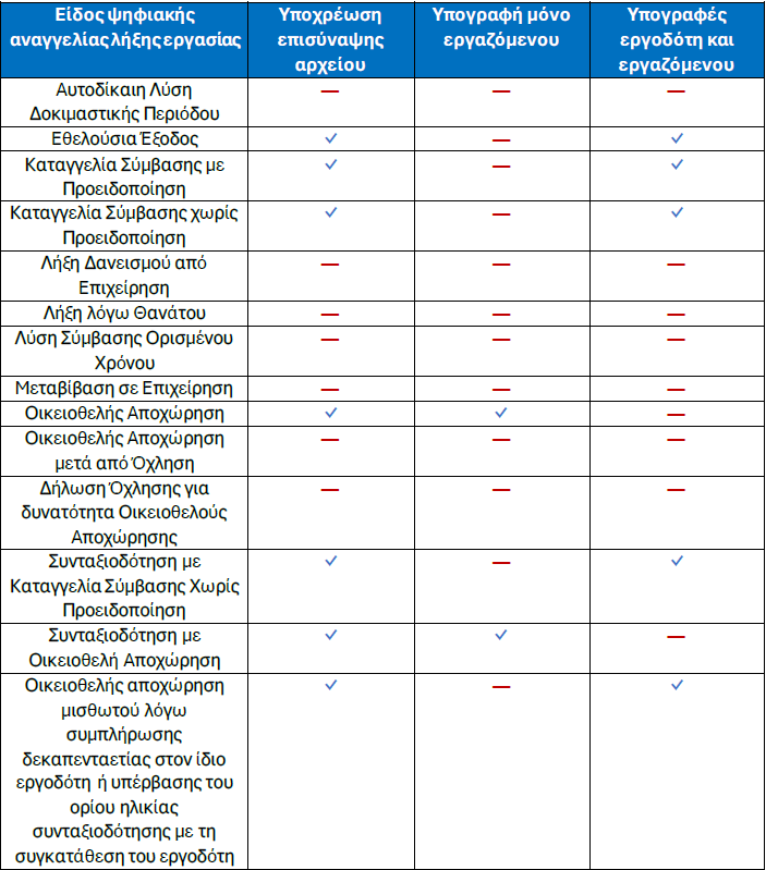 Πίνακας σχετικά με την υποχρέωση επισύναψης αρχείου με υπογραφές στα έντυπα της Λήξης