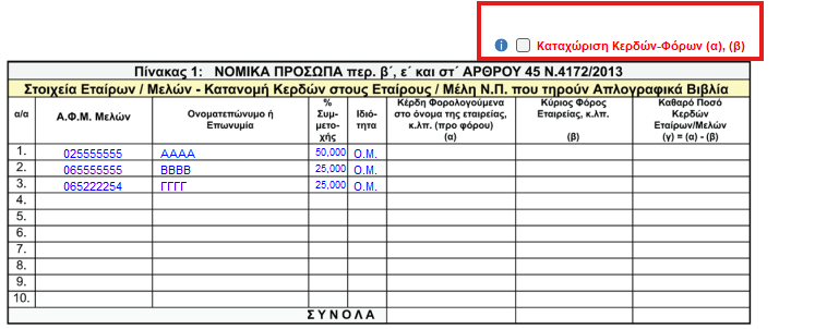 Προσθήκη νέου πεδίου επιλογής (check box) στον Πίνακα 1 της σελίδας 6 (Στοιχεία Εταίρων/Μελών-Κατανομή Κερδών στους Εταίρους/ Μέλη Ν.Π. που τηρούν Απλογραφικά Βιβλία) , το οποίο παρέχει τη δυνατότητα χειροκίνητης τροποποίησης των ποσών του Πίνακα 1.