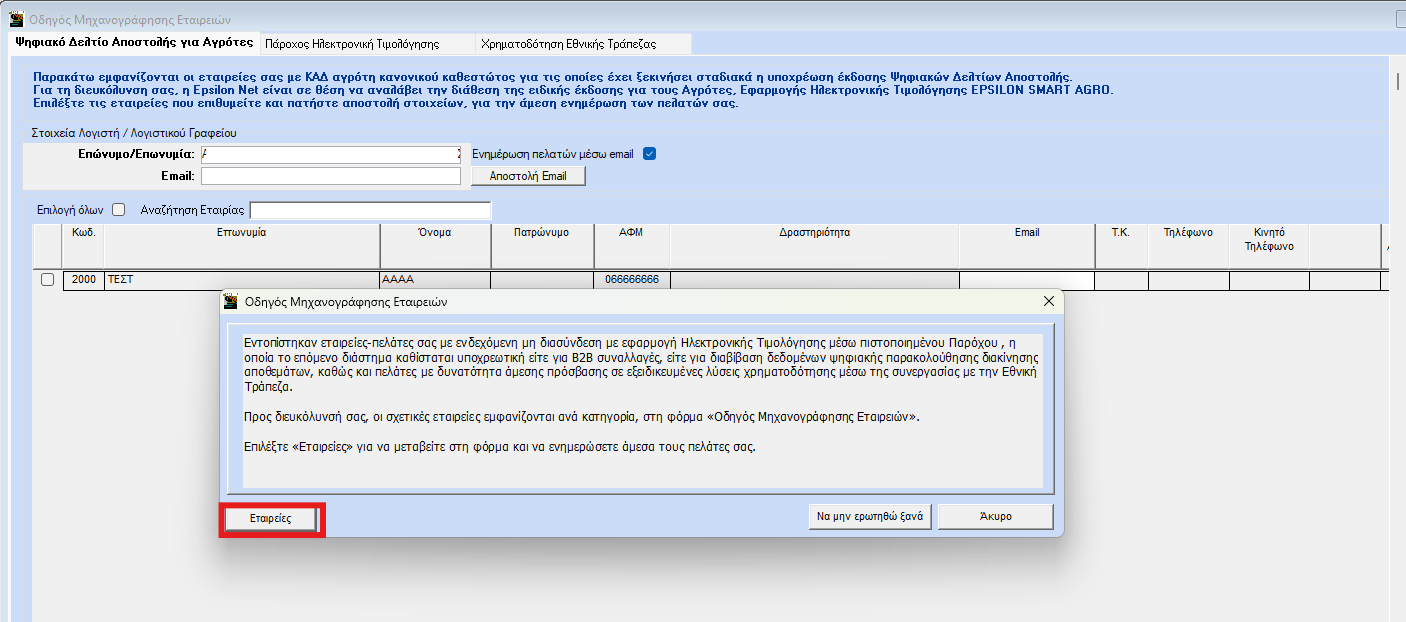 - Ο οδηγός μηχανογράφησης ανοίγει αυτόματα μετά την είσοδο του χρήστη στην εφαρμογή και εμφανίζει το παρακάτω μήνυμα. Για να δείτε τις εταιρείες που αφορά επιλέγετε «Εταιρείες». Για τη διευκόλυνση σας οι εταιρείες εμφανίζονται σε ξεχωριστές λίστες (Ψηφιακό Δελτίο Αποστολής Αγρότες, Πάροχος Ηλεκτρονικής Τιμολόγησης, Χρηματοδότηση Εθνικής τράπεζας).