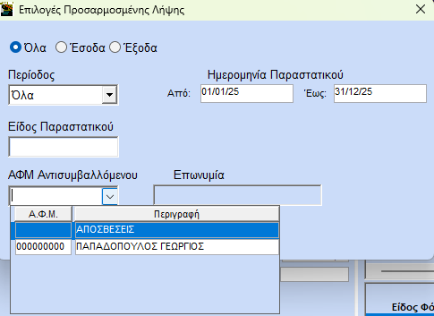 Εάν για παράδειγμα σε προηγούμενη λήψη δεν έχετε καταχωρήσει τα παραστατικά εξόδων του Οκτωβρίου, και στην νεά προσαρμοσμένη λήψη επιλέξετε στα κριτήρια μόνο Έσοδα και μήνα Νοέμβρίος. Τότε στη  λήψη θα εμφανίζονται και τα έξοδα του Οκτωβρίου.