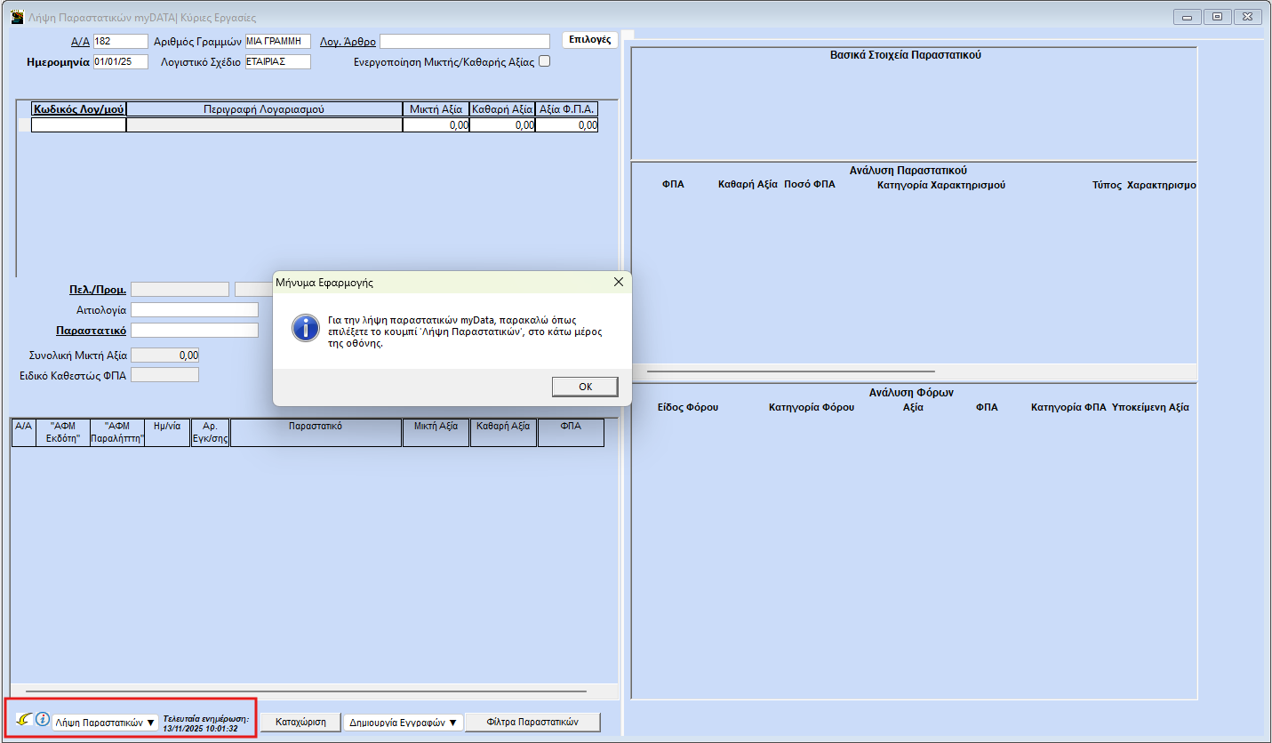 δ. Στην οθόνη εμφανίζεται πλέον πληροφορία σχετικά με το πότε πραγματοποιήθηκε η τελευταία λήψη (ημερομηνία και ώρα), στη δεξιά πλευρά της επιλογής «Λήψη Παραστατικών».