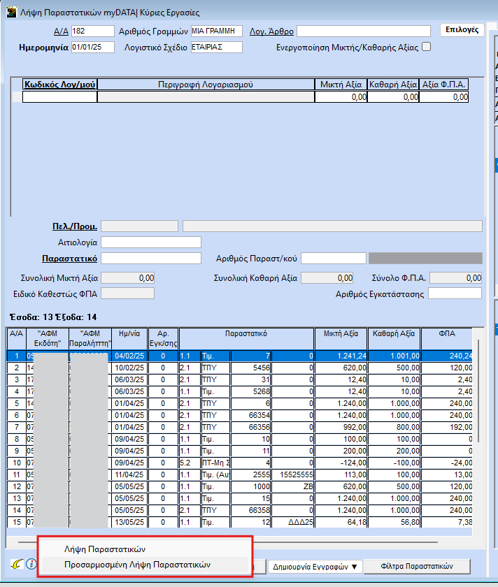 • Με την επιλογή αυτή πραγματοποιείται λήψη όλων των παραστατικών που υπάρχουν στην ψηφιακή πλατφόρμα myDATA της ΑΑΔΕ.