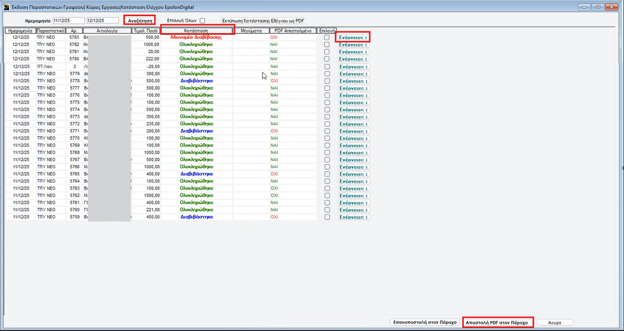 Στήλη «PDF Aπεσταλμένα» και επιλογή «Ενέργειες»: