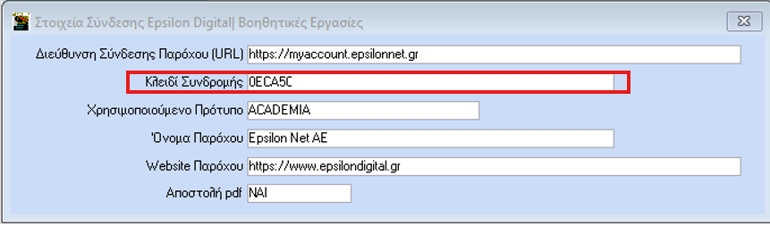 - Θα καταχωρήσετε το «Κλειδί Συνδρομής» (παρόχου) στην επιλογή «Office Managment \ Τιμολόγηση Πελατών \ Βοηθητικές Εργασίες \ Στοιχεία Σύνδεσης Εpsilon Digital».