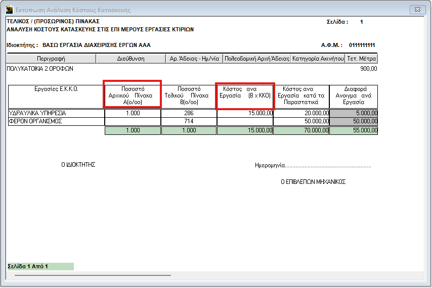 Στην εκτύπωση «Ανάλυση Κόστους Κατασκευής», έχουν ενημερωθεί «Ποσοστό Αρχικού Πίνακα Α(ο/οο)» και «Κόστος ανά Εργασία (ΒxKKO).