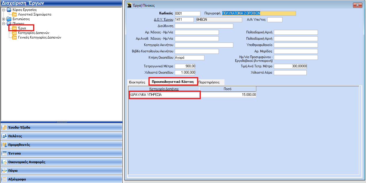 Θα πρέπει στην επιλογή «Διαχείριση Έργων\ Πίνακες\ Έργα» να καλέσετε με αναζήτηση με το πλήκτρο F9, ή να πληκτρολογήσετε, το έργο που σας ενδιαφέρει. Στη συνέχεια, στη σελίδα (tab) «Προϋπολογιστικό Κόστος» να επιλέξετε με βελάκι στο πεδίο «Κατηγορία Δαπάνης», μη γενικές δαπάνες και να συμπληρώσετε αντίστοιχα το πεδίο «Ποσό».