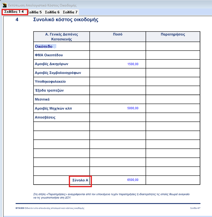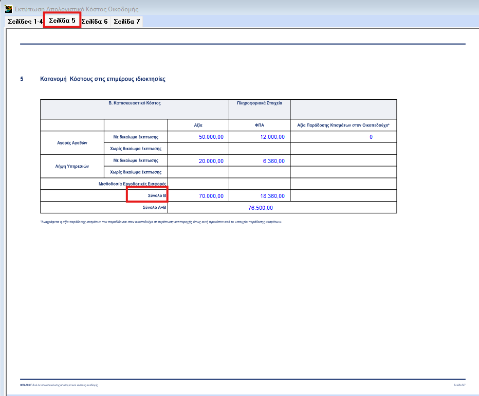 - Επιλέγοντας έναν από τους παραπάνω τρόπους ενημέρωνονται 4η και 5η σελίδα (Σύνολο Α+Β) στο έντυπο στο έντυπο «Απολογιστικό Κόστος Οικοδομής».