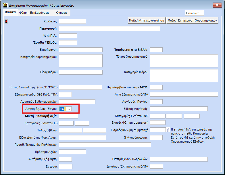 α) Σε περίπτωση που η εγγραφή που θα κάνετε θέλετε να ενημερώσει και το «Βιβλίο Εσόδων-Εξόδων» και το «Βιβλίο Κοστολογίου», θα πάτε στην επιλογή «Έσοδα-Έξοδα\ Κύριες Εργασίες Καταχώριση Κινήσεων» και θα επιλέξετε λογαριασμό διαχείρισης έργου (δηλ. λογαριασμό που έχει στην επιλογή «Έσοδα-Έξοδα\ Κύριες Εργασίες\ Διαχείριση Λογαριασμών» συμπληρωμένο με «ΝΑΙ» το πεδίο «Λογ/σμος Διαχ. Έργου»).