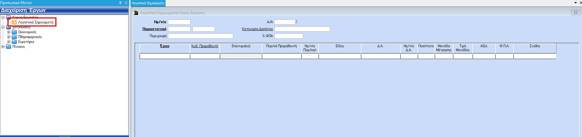 β) Σε περίπτωση που θέλετε να ενημερώσετε μόνο το Βιβλίο Κοστολογίου ή που δεν έχετε το module Έσοδα-Έξοδα, θα πραγματοποιήσετε εγγραφή από την επιλογή «Διαχείριση Έργων\ Κύριες Εργασίες\ Λογιστικά Σημειώματα». Και στις δύο περιπτώσεις θα πρέπει, εκτός από το έργο, να επιλέξετε την κατηγορία δαπάνης. Εάν το είδος της κατηγορίας δαπάνης είναι «Γενική Δαπάνη», θα ενημερωθεί στο έντυπο «Απολογιστικό Κόστος Οικοδομής» ο πίνακας Α των γενικών δαπανών κατασκευής. Εάν το είδος της κατηγορίας δαπάνης είναι «Αγορές Αγαθών» ή «Λήψη Υπηρεσιών» ή «Μισθοδοσία», θα ενημερωθεί στο έντυπο «Απολογιστικό Κόστος Οικοδομής» ο πίνακας Β του κατασκευαστικού κόστους.