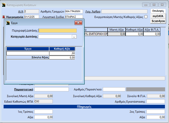 Κατά την καταχώρηση, θα εμφανιστεί στην οθόνη το παράθυρο «Έργα» στο οποίο συμπληρώνετε τα πεδία «Κατηγορία Δαπάνης», «Έργο» και «Καθαρή Αξία», η οποία κλείνοντας το παράθυρο ενημερώνει την καθαρή αξία του λογαριασμού.