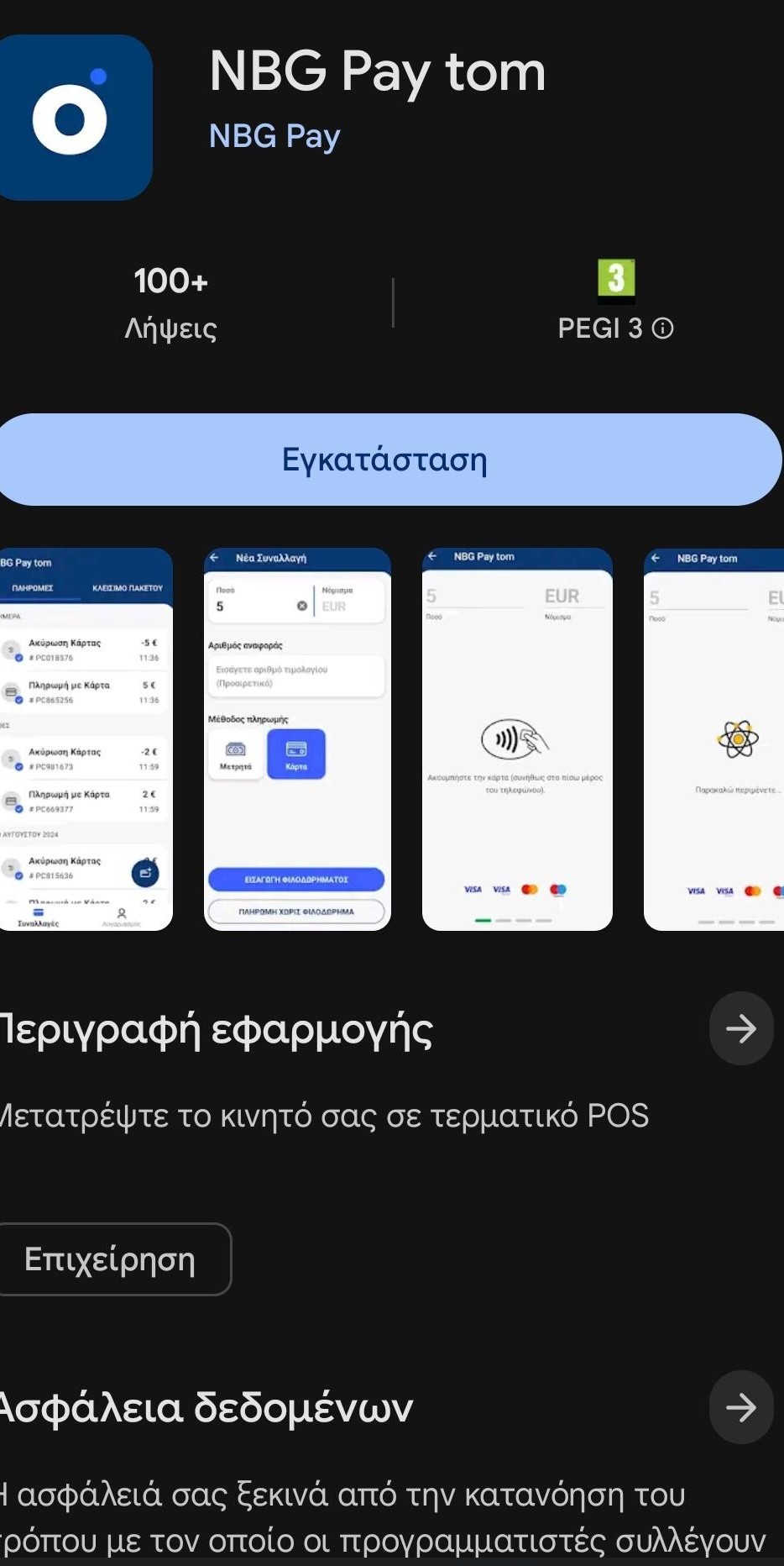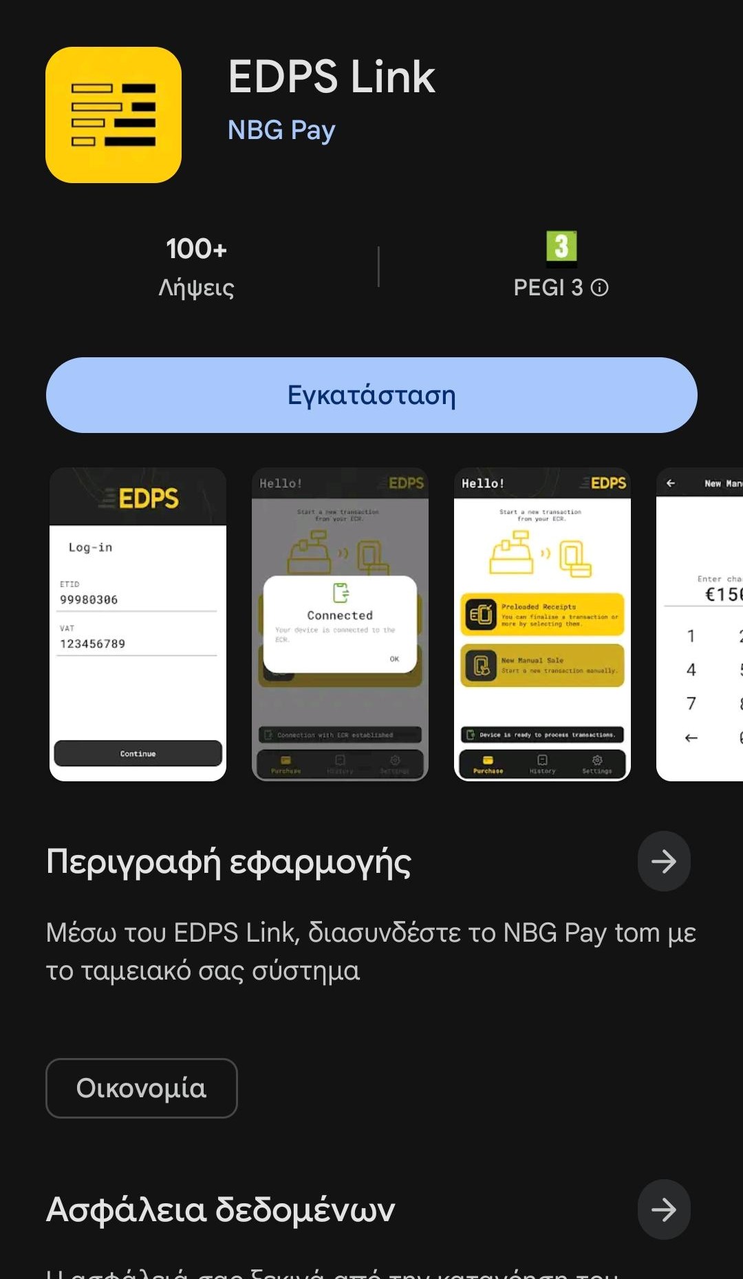 Θα χρειαστεί να μεταβείτε μέσα από μία Αndroid συσκευή (αυτή που θα χρησιμοποιηθεί σαν soft pos) που έχετε στη διάθεση σας στο play store και να κάνετε εγκατάσταση των εφαρμογών ” EDPS Link ” και ” NBG Pay Τom “. Αφού ολοκληρωθεί η εγκατάσταση των εφαρμογών ανοίγετε την εκάστοτε εφαρμογή ξεχωριστά συμπληρώνοντας τα απαραίτητα στοιχεία εισόδου που ζητώνται .