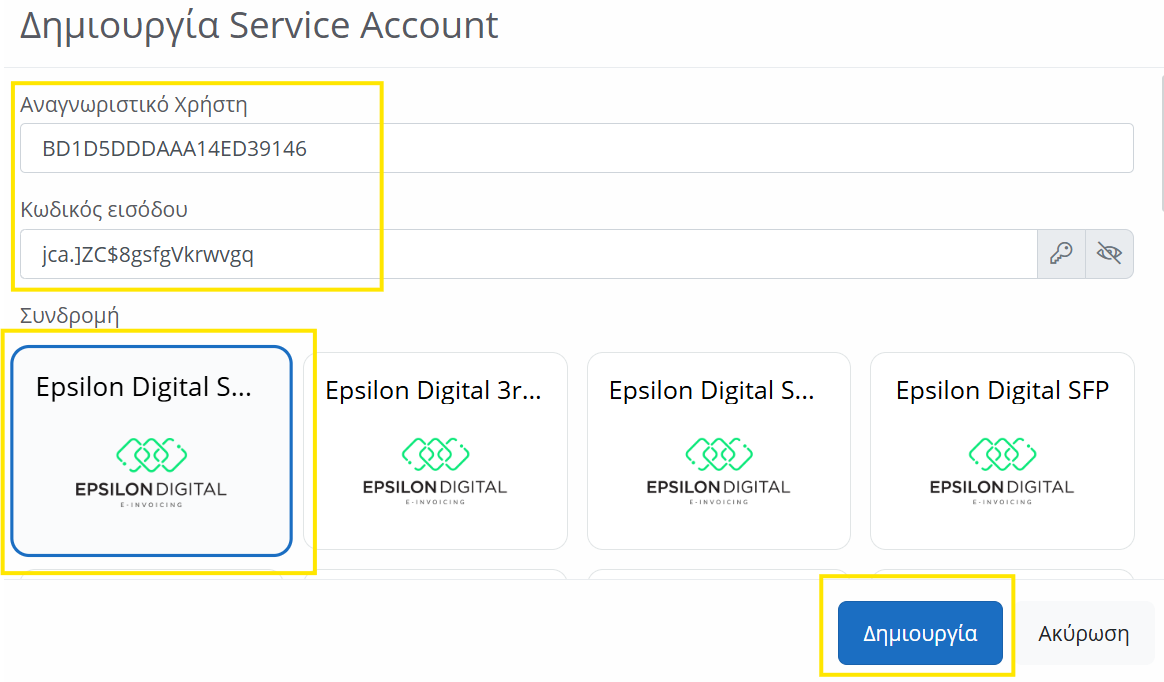Επιλέγετε τη συνδρομή Epsilon Digital που σας ενδιαφέρει να συνδέσετε και πριν ολοκληρώσετε την αποθήκευση του νέου χρήστη (Δημιουργία), θα πρέπει να αντιγράψετε το όνομα χρήστη και τον κωδικό πρόσβασης που δημιουργεί η εφαρμογή για την εσωτερική σύνδεση της συνδρομή σας με την υπηρεσία Epsilon Digital Smart.