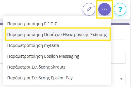 Θα μεταβείτε από το κεντρικό μενού ->  Ρυθμίσεις -> (Γενικές) Αρχικοποίηση -> Παραμετροποίηση Εφαρμογής -> Ενέργειες (…)  -> Παραμετροποίηση Παρόχου Ηλεκτρονικής Έκδοσης .