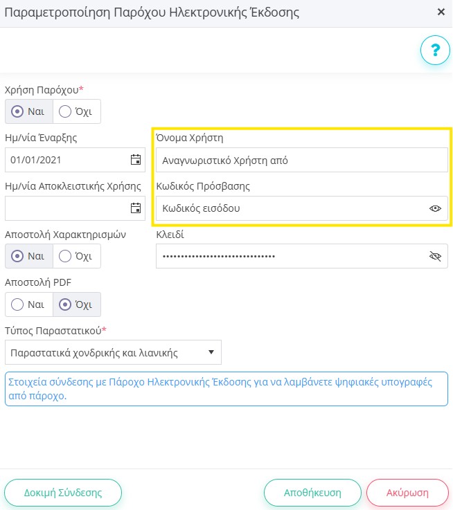 Το κλειδί της συνδρομής επίσης πρέπει να καταχωρηθεί στην Παραμετροποίηση Παρόχου Ηλεκτρονικής Έκδοσης.