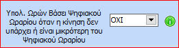 και υπάρχει ημέρα με Είδος Ωραρίου = ”Τηλεργασία” και δεν υπάρχει κίνηση κάρτας εργασίας την ημέρα αυτή, τότε οι ώρες (της ημέρας αυτής) θα υπολογίζονται με βάση το ψηφιακό ωράριο. Για παράδειγμα, η παραπάνω παράμετρος έχει τιμή ”ΟΧΙ” και υπάρχει σε μια ημέρα με Τηλεργασία ωράριο 09:00 – 17:00 χωρίς κίνηση εισόδου – εξόδου. Για την ημέρα αυτή θα υπολογιστούν τελικά 8 ώρες βάσει του ψηφιακού ωραρίου του εργαζόμενου.