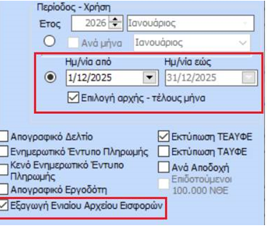 Συγκεκριμένα, σε περιπτώσεις που στην ίδια μισθολογική περίοδο υπάρχουν επιπλέον των αποδοχών του μήνα και αποδοχές δώρων, επιδομάτων, αδείας, ασθένειας, υπερωρίες, bonus κ.λπ., θα πρέπει να υποβάλλεται ένα ενιαίο αρχείο με κωδικό «01. ΚΑΝΟΝΙΚΗ» το οποίο περιλαμβάνει τις εγγραφές με τους κωδικούς του μισθού και των λοιπών περιόδων / αποδοχών. Για το λόγο αυτό στην εφαρμογή μισθοδοσίας, ο χρήστης θα πρέπει να επιλέγει το ημερολογιακό διάστημα «Ημ/νία Από … Ημ/νία Έως» και στη συνέχεια την επιλογή «Εξαγωγή Ενιαίου Αρχείου Εισφορών», όπου ο χρήστης οφείλει να την επιλέξει, έτσι ώστε κατά την εξαγωγή αρχείου να παράγεται ένα ενιαίο αρχείο με όλες τις τυχόν εγγραφές των πρόσθετων αποδοχών και λοιπών περιόδων και να πραγματοποιείται σωστά η υποβολή (βλ. εικόνα παρακάτω). Σε περίπτωση που υπάρχει μόνο η αποδοχή του μισθού τότε το πεδίο της ενιαίας εξαγωγής παραμένει ενεργοποιημένο και δεν επηρεάζει πουθενά την υποβολή, η οποία θα γίνεται με τον ίδιο τρόπο.