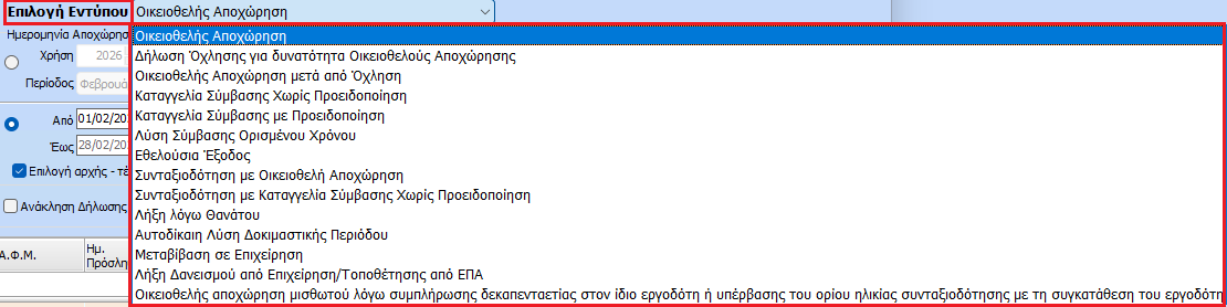 Αν για παράδειγμα, ο χρήστης, στο πεδίο αυτό της καρτέλας 2 του εργαζόμενου, έχει επιλέξει «Οικειοθελής», τότε αυτό σημαίνει ότι ο εργαζόμενος αυτός θα εμφανιστεί στην Επιλογή Εντύπου -> Οικειοθελής Αποχώρηση