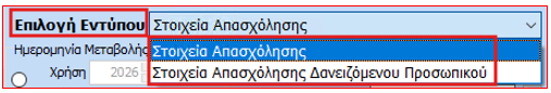 Στη φόρμα του νέου αυτού εντύπου υπάρχει, στο επάνω μέρος, το πεδίο «Επιλογή Εντύπου» στο οποίο ο χρήστης επιλέγει το είδος αναγγελίας της μεταβολής απασχόλησης που επιθυμεί να υποβάλει.