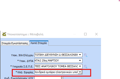 Στις περιπτώσεις που απαιτείται ενημέρωση του ΚΑΔ της επιχείρησης μεταβείτε στα στοιχεία της εταιρείας στην υποκαρτέλα ΚΑΔ Εφορίας και προσθέστε τον νέο ΚΑΔ επιλέγοντάς τον μέσω της ενημερωμένης διαθέσιμης λίστας.Εν συνεχεία μεταβείτε στην καρτέλα 2.Υποκαταστήματα, Λοιπά Στοιχεία και επιλέξτε τον στο εκάστοτε υποκατάστημα στο πεδίο ΚΑΔ Εφορίας.