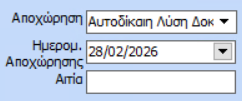 Στην καρτέλα 2. Στοιχεία απασχόλησης, στο πεδίο Αποχώρηση θα ορίσετε «Αυτοδίκαιη Λύση Δοκιμαστικής Περιόδου» και την Ημ/νια Αποχώρησης του εργαζόμενου.