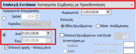 - Στο πεδίο «Επιλογή Εντύπου» θα επιλέξετε το Είδος Αναγγελίας που θέλετε να υποβάλλετε και θα ορίσετε στις ημερομηνίες «Από – Έως», διάστημα στο οποίο περιλαμβάνεται η ημ/νια προειδοποίησης του εργαζόμενου.