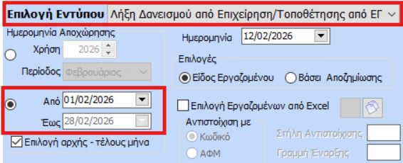 - Στο πεδίο «Επιλογή Εντύπου» θα επιλέξετε το Είδος Αναγγελίας που θέλετε να υποβάλλετε και θα ορίσετε στις ημερομηνίες «Από – Έως», διάστημα στο οποίο περιλαμβάνεται η ημ/νια αποχώρησης του εργαζόμενου.
