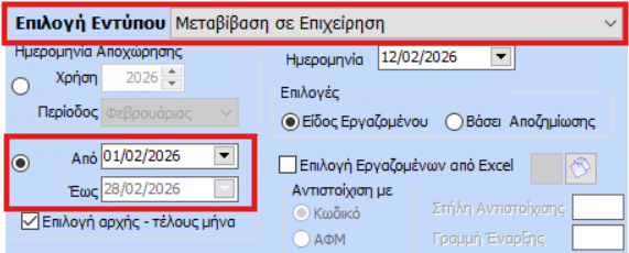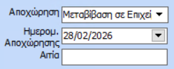Στην καρτέλα 2. Στοιχεία απασχόλησης, στο πεδίο Αποχώρηση θα ορίσετε «Μεταβίβαση σε Επιχείρηση» και την Ημ/νια Αποχώρησης του εργαζόμενου.