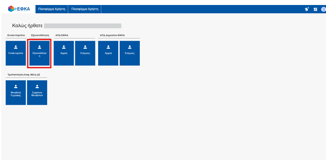 Επιλέγετε την διακριτή επιλογή «Εξουσιοδότηση» προκειμένου να εξουσιοδοτήσετε φυσικά ή νομικά πρόσωπα, ή να διαχειριστείτε τις εξουσιοδοτήσεις σας.