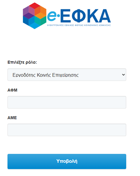 Επιλέγετε τον ρόλο «Εργοδότης Κοινής Επιχείρησης» ή «Εργοδότης Δημοσίου» και συμπληρώνει τα αναγνωριστικά ΑΦΜ και ΑΜΕ της επιχείρηση.