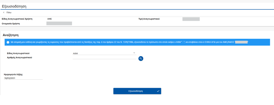 Συμπληρώνετε το ΑΦΜ του προσώπου που θέλετε να εξουσιοδοτήσετε στο πεδίο Αριθμός Αναγνωριστικού και πατάτε το κουμπί της Εξουσιοδότησης.