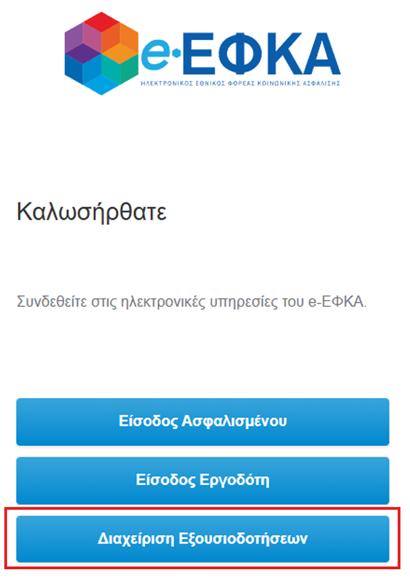 Μετά την επιτυχή πιστοποίηση ο χρήστης επιλέγει Διαχείρηση Εξουσιοδοτήσεων