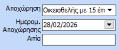 Στην καρτέλα 2. Στοιχεία απασχόλησης, στο πεδίο Αποχώρηση θα ορίσετε «Οικειοθελής με 15ετή προϋπηρεσία» και την Ημ/νια Αποχώρησης του εργαζόμενου.