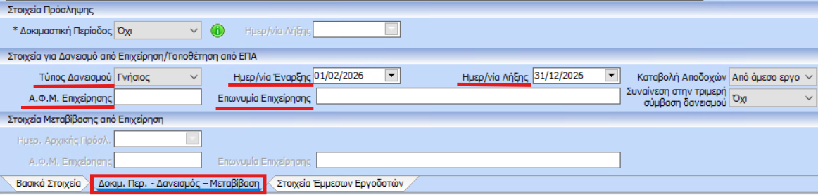 Στο tab «Δοκ. Περ. – Δανεισμός – Μεταβίβαση», στην ενότητα «Στοιχεία για Δανεισμό Από Επιχείρηση/Τοποθέτηση από ΕΠΑ» θα χρειαστεί να συμπληρώσετε: