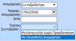 Στην καρτέλα 2. Στοιχεία απασχόλησης, στο πεδίο Αποχώρηση θα ορίσετε «Συνταξιοδότηση», την Ημ/νια Αποχώρησης του εργαζόμενου και τον τρόπο συνταξιοδότησης (Με Οικειοθελή Αποχώρηση).