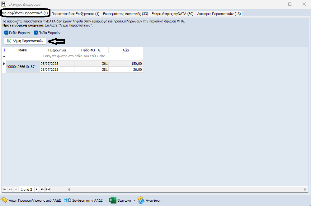 - Παραστατικά που υπάρχουν στην Προσυμπλήρωση και δεν έχουν αντληθεί στην εφαρμογή.