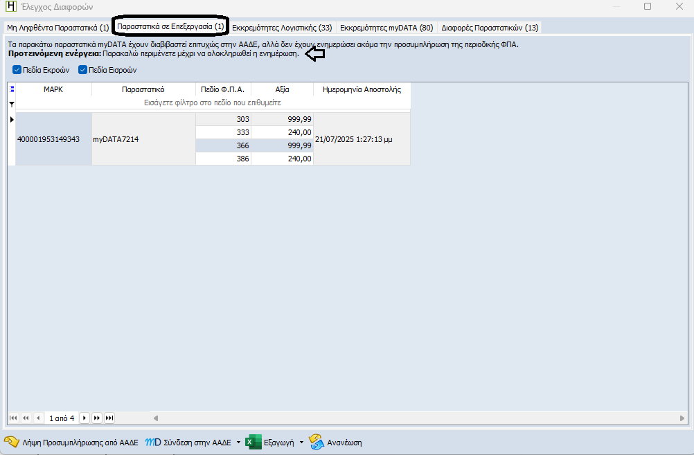 Παραστατικά που έχουν διαβιβαστεί επιτυχώς, αλλά δεν έχουν ενημερώσει ακόμα την προσυμπλήρωση της περιοδικής ΦΠΑ.
