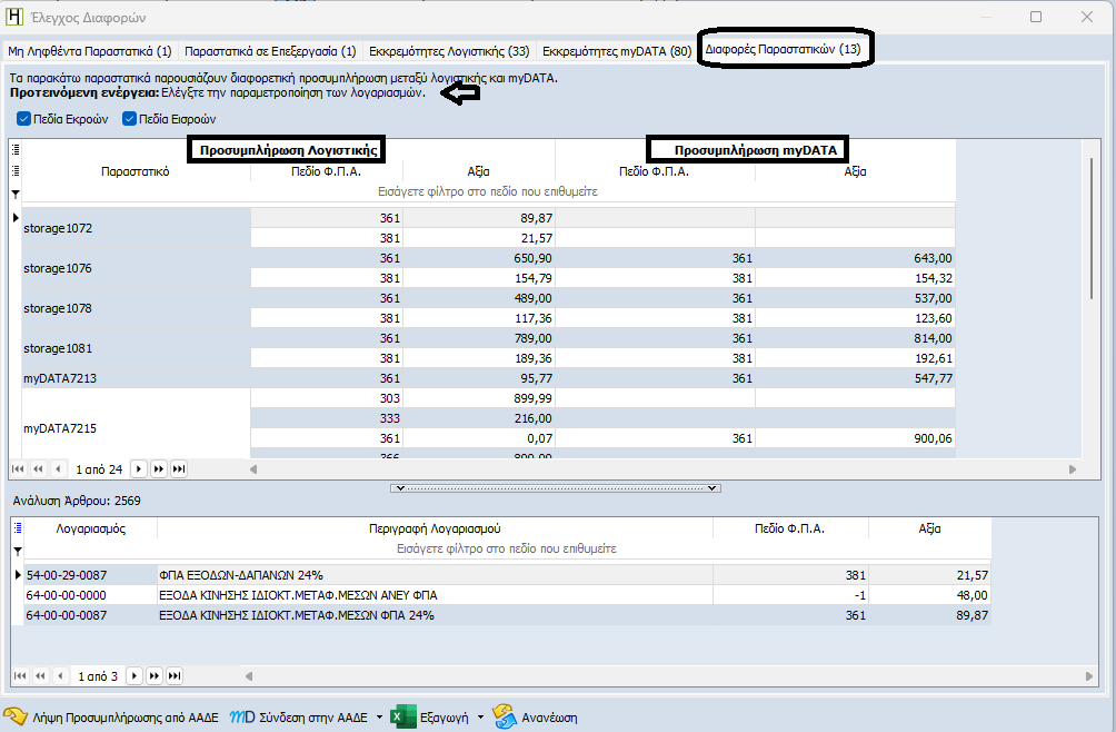 Παραστατικά που παρουσιάζουν διαφορετική συμπλήρωση μεταξύ Λογιστικής και myDATA.