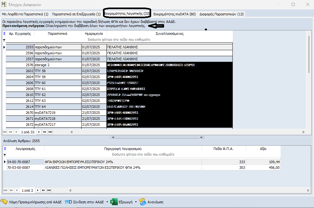 Προτεινόμενη ενέργεια: Ελέγξτε την παραμετροποίηση των λογαριασμών Λογιστικής (πεδίο περιοδικής Φ2 στη μεταβολή Λογαριασμού) στις καταχωρήσεις ή/και τους χαρακτηρισμούς ΦΠΑ που διαβιβάστηκαν στο myDATA (μενού myDATA – Ολοκληρωμένα).