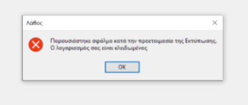 Εάν κατα τη διαδικασία εκτύπωσης εμφανιστεί το παραπάνω μήνυμα και έχει κλειδωθει ο λογαριασμός σας, θα πρεπει να επικοινωνήσετε με το Τμήμα Υποστήριξης Χρήσης Λογιστικών εφαρμογών, καλώντας στο 2311 997777.