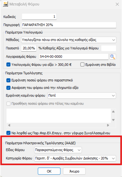 Σχετίζεται με τους παρακρατούμενους φόρους. Συγκεκριμένα θα πρέπει να ελέγξετε αν έχει επιλεγεί κατηγορία φόρου. Στο μενού Παράμετροι – Παρακρατούμενοι Φόροι, συμπληρώνετε τις αντίστοιχες τιμές ανά περίπτωση, στα πεδία “Παράμετροι Ηλεκτρονικής Τιμολόγησης (ΑΑΔΕ)”.