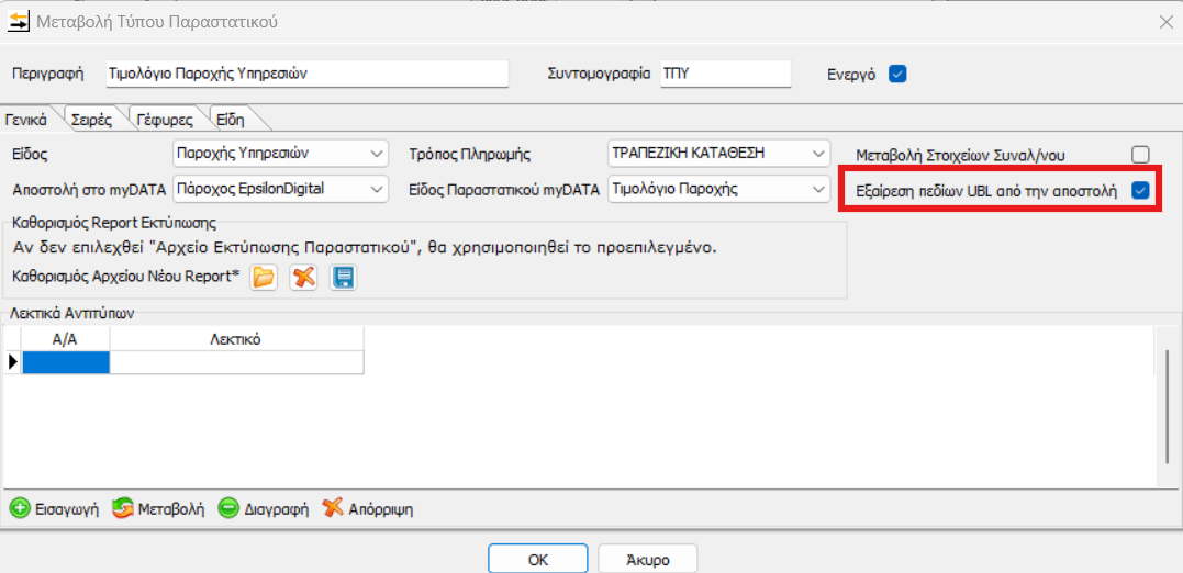 Θα πρέπει να ελέγξετε για τις γραμμές που είναι άνευ ΦΠΑ, εάν μέσα στον τύπο παραστατικού έχει επιλεγεί το checkbox «εξαίρεση πεδίων UBL από την αποστολή». Μεταβείτε στο μενού Τιμολόγηση – Τύποι Παραστατικών και στον Τύπο που τιμολογείτε με αποστολή μέσω Παρόχου, επιλέγετε το σχετικό checkbox της εξαίρεσης σύμφωνα με την παρακάτω εικόνα: