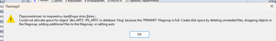 Μήνυμα Σφάλματος: Could not allocate space for object 'dbo.ARTS'. PK_ARTS' in database ... or setting auto.