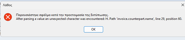 Μήνυμα Σφάλματος: After parsing a value an unexpected character was encountered: H. Path 'invoice.counterpart.name, line 29, position 60.
